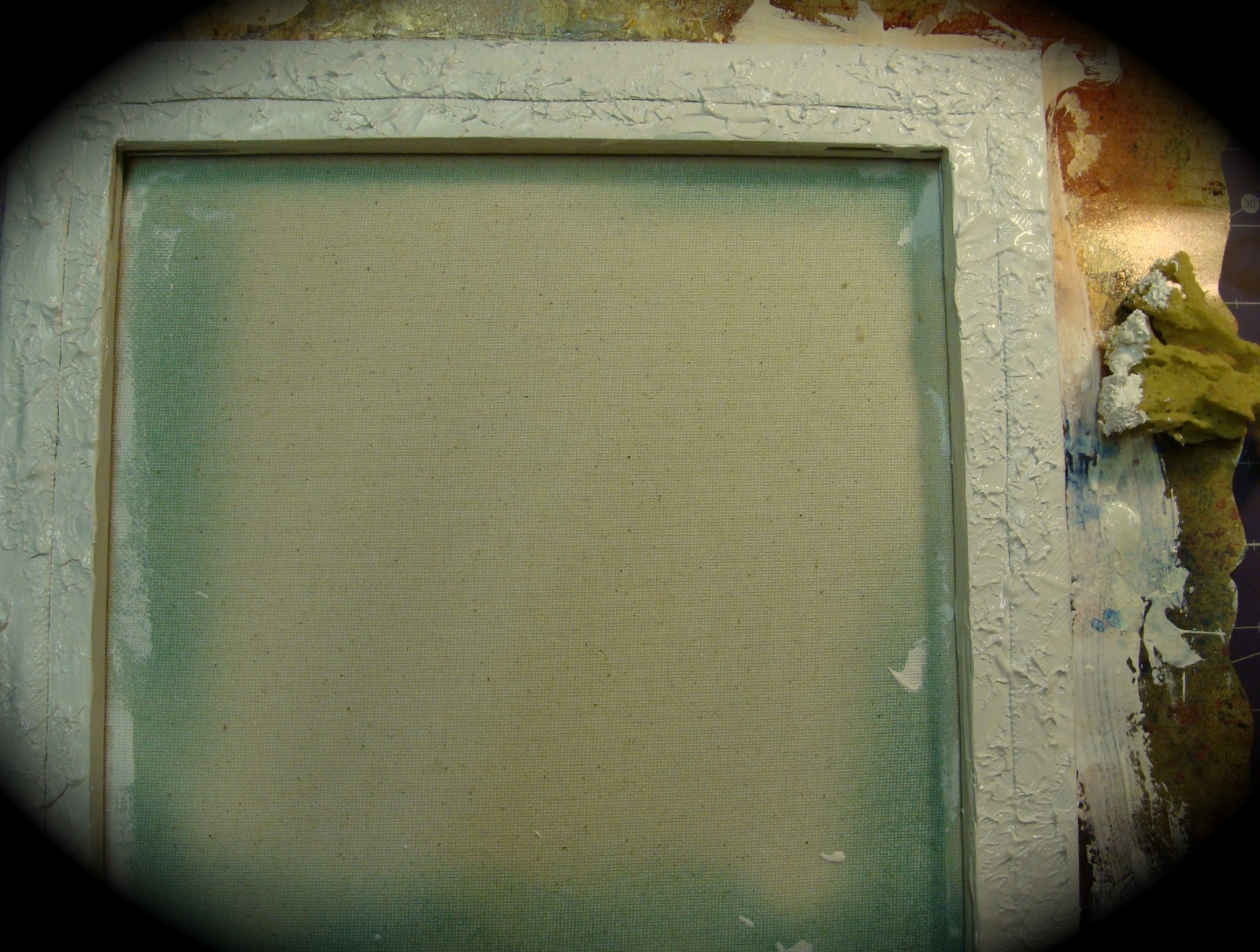 Here's a few photos, sorry about the quality. I first started by using Gesso really heavy on the reverse side of the canvas. I then took a sponge and dapped for some texture. After drying I misted the frame and let that dry. Then I used some Tim Holtz Distress Ink (Gathered Twigs) to ink some more brown where I wanted. For the Dusty Attic corner flourishes I used some Distress Embossing Ink and then adhered some Mica chips. For the grungeboard flowers I first applied some Tim Holtz Distress Paint (Antiqued Bronze) and then applied some Shimmerz Paint (Sparklious) and put the heat gun to it. I also used that process on the small Dusty Attic corner pieces. I have a tutorial posted about the Memory Glass piece on the forum at Scraps of Darkness . TFL!!